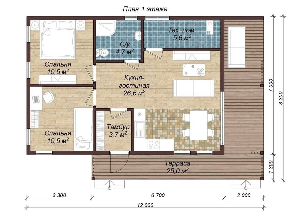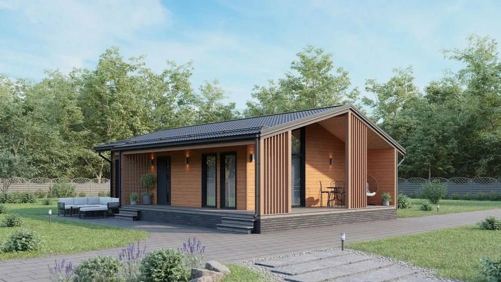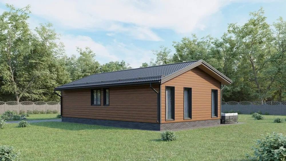 Удобный и современный одноэтажный дом, созданный для комфортной жизни. Планировка разделяет приватную и общую зоны: две изолированные спальни обеспечивают тишину и уединение, а просторная кухня-гостиная становится центром дома для общения и отдыха всей семьи. Входная группа с тамбуром защищает дом от холода и грязи, предусмотрен санузел и отдельное техническое помещение для инженерных систем и хранения. Большая терраса логично дополняет жилое пространство и идеально подходит для отдыха, семейных обедов и приема гостей. Дом отлично подходит как для постоянного проживания, так и для загородного отдыха, сочетая практичность, комфорт и продуманную эргономику.