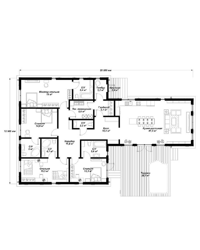Одноэтажный дом с террасой для комфортной жизни. Практичный и функциональный проект площадью около 170 м² с удобной планировкой и чётким зонированием пространства. Просторная кухня-гостиная объединена с выходом на большую террасу, что создаёт комфортную зону для отдыха и встреч с близкими. В доме предусмотрены несколько санузлов, гардеробная, техническое помещение и удобная входная группа. Продуманное расположение помещений обеспечивает комфорт для повседневной жизни и рациональное использование площади. Проект подходит для круглогодичного проживания и может быть адаптирован под ваши задачи и предпочтения.